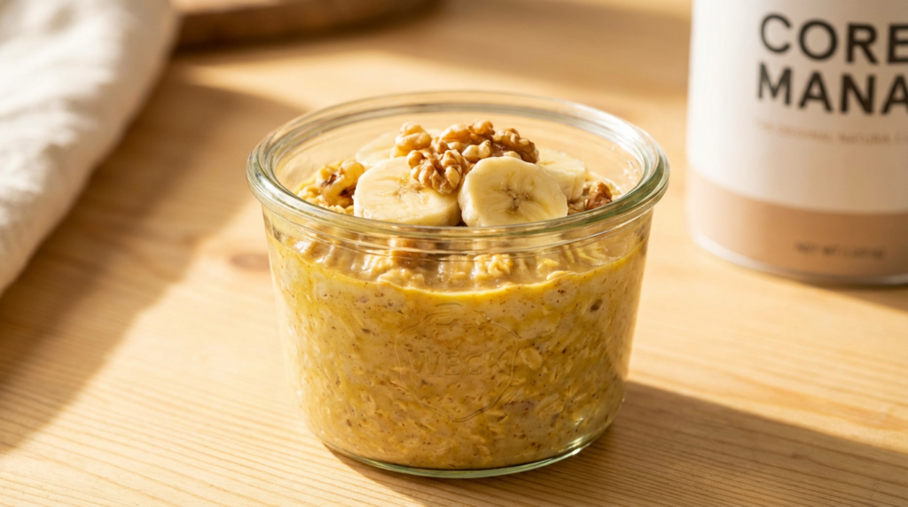 2. Am Morgen das CORE MANA Pulver unterrühren (ggf. einen Schluck Wasser nachgießen, falls es zu fest ist).